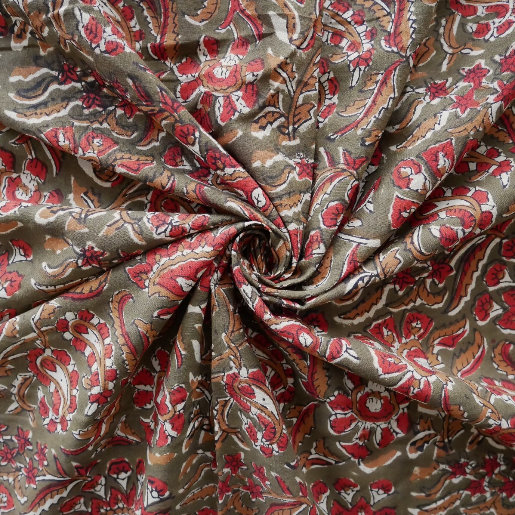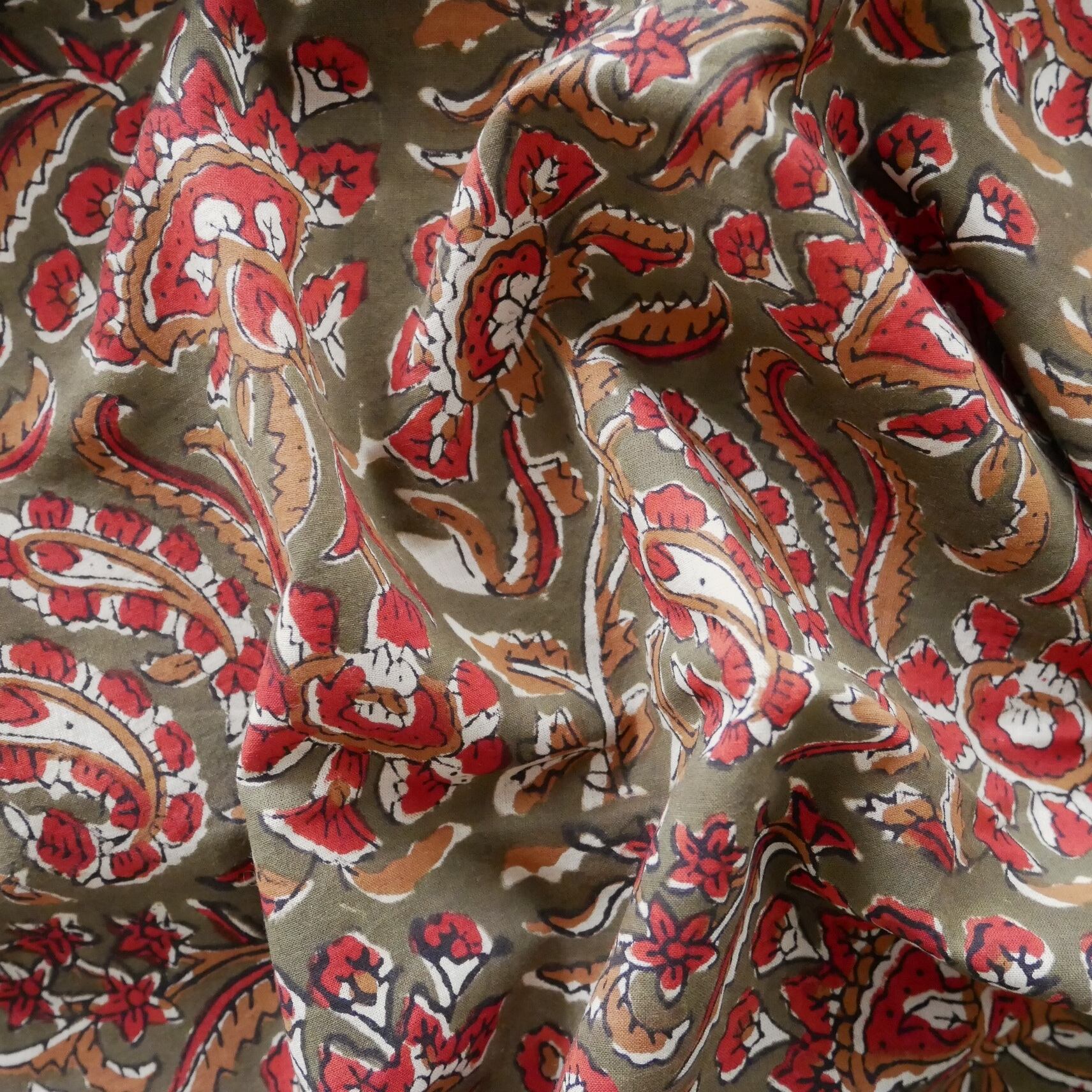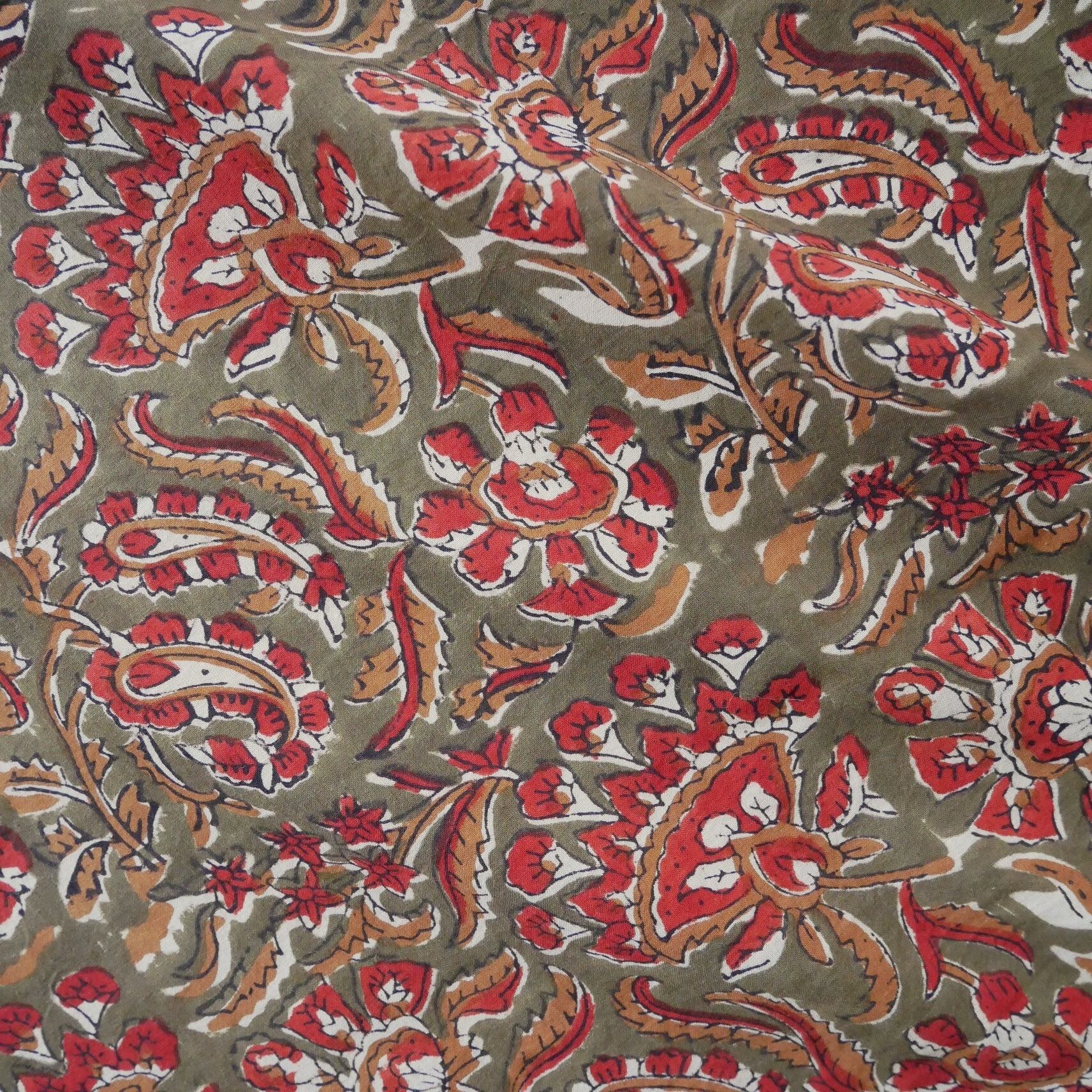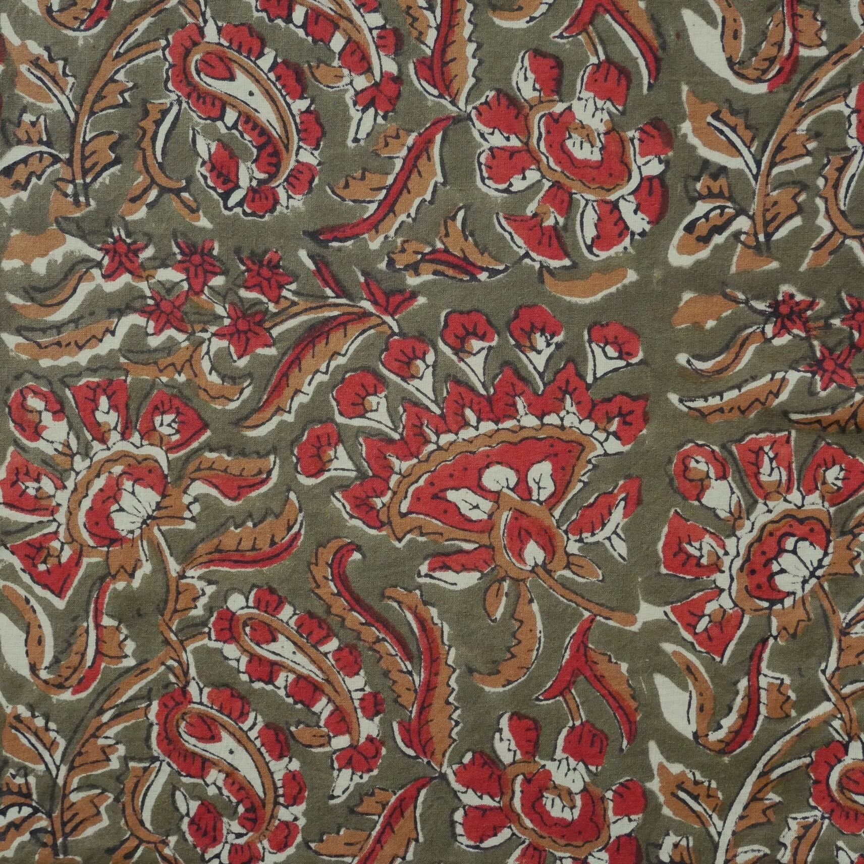 ハンドブロックプリント生地 インド更紗 綿生地 オリーブ色ベース×レッドやブラウンのボタニカル柄 薄手コットン BC-201024