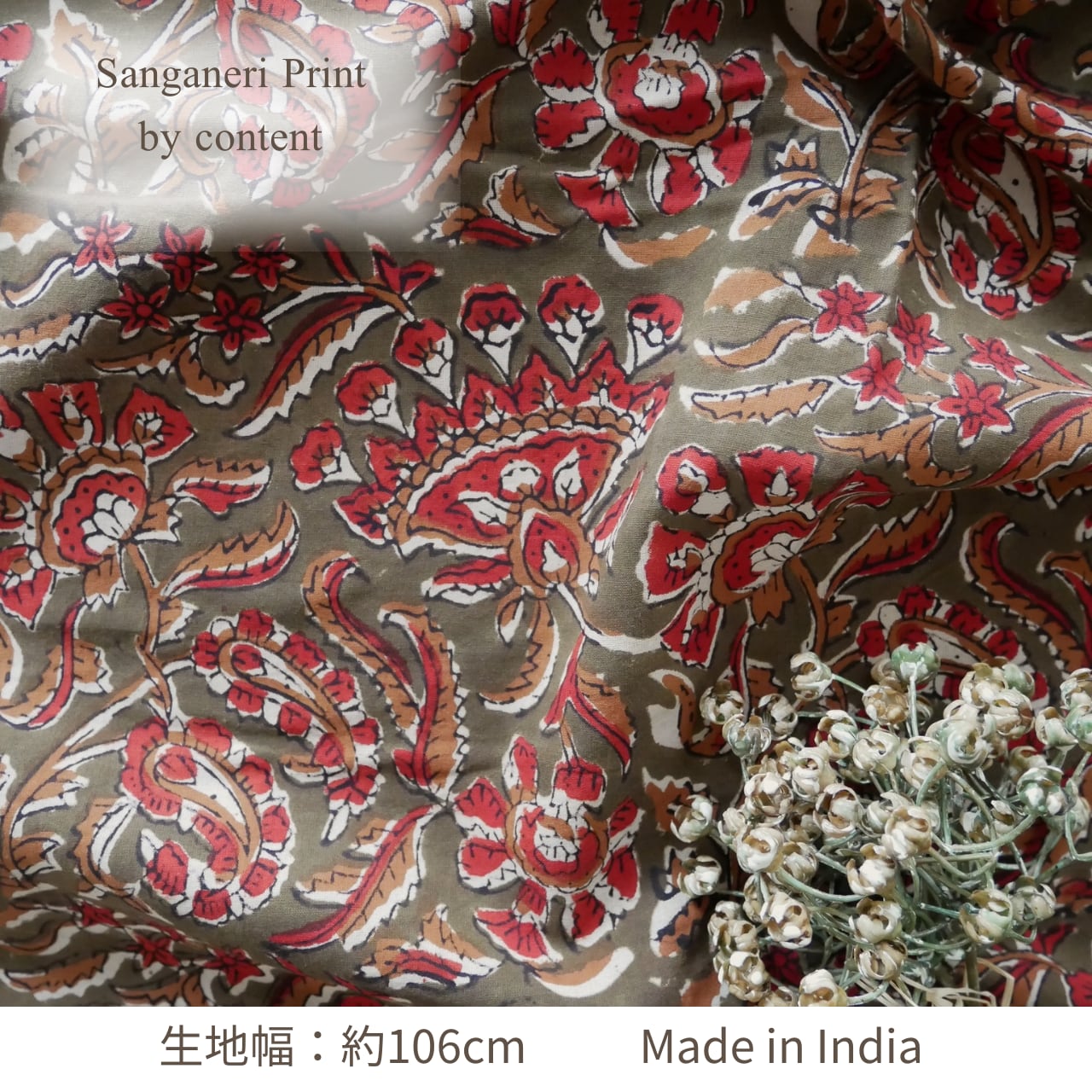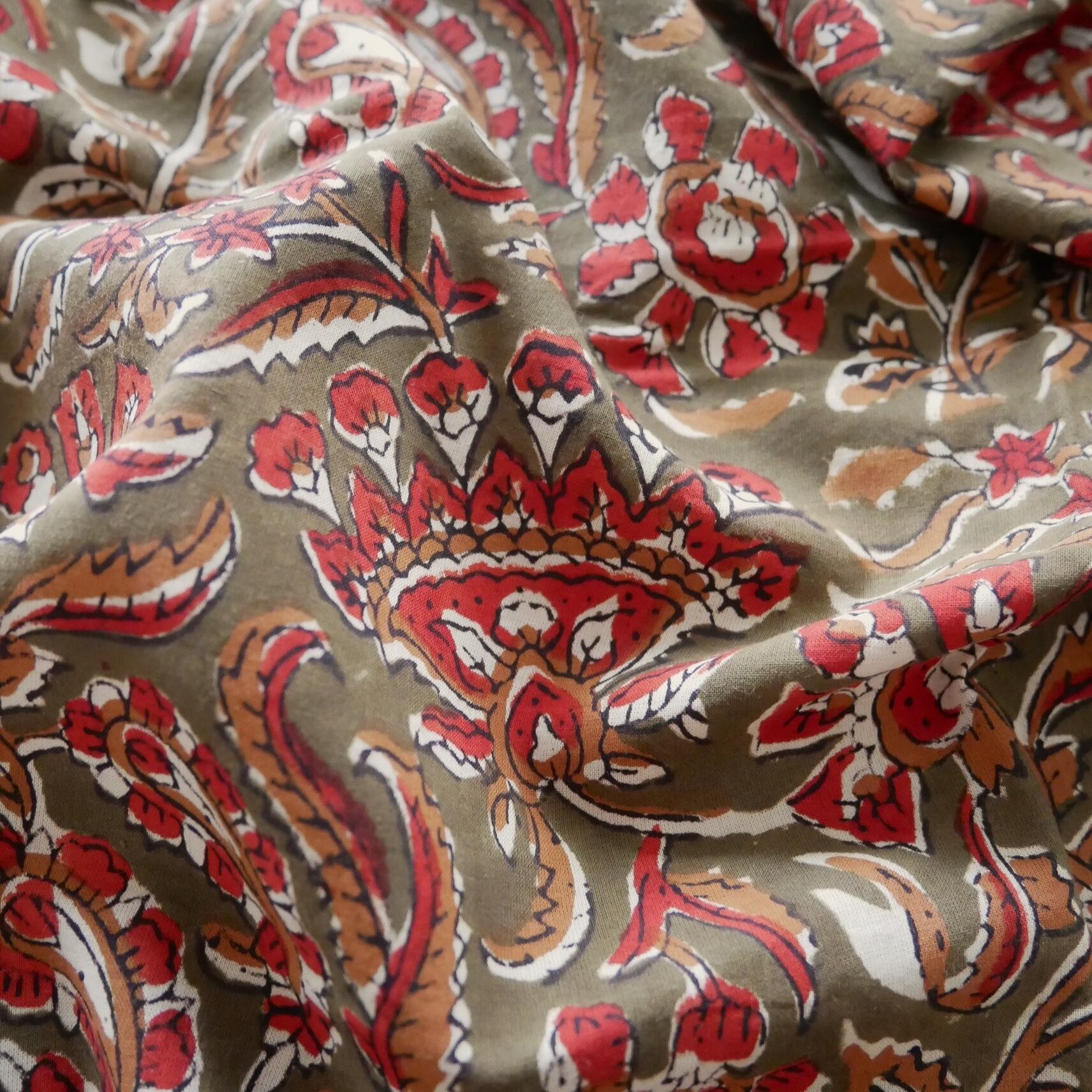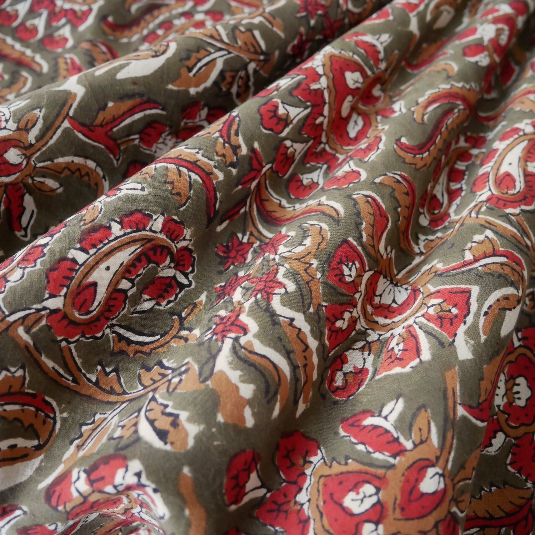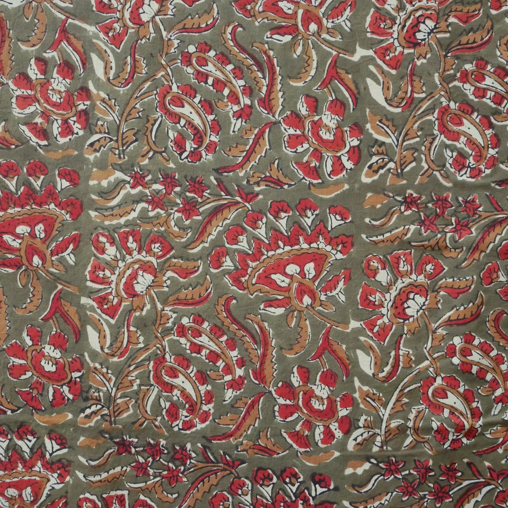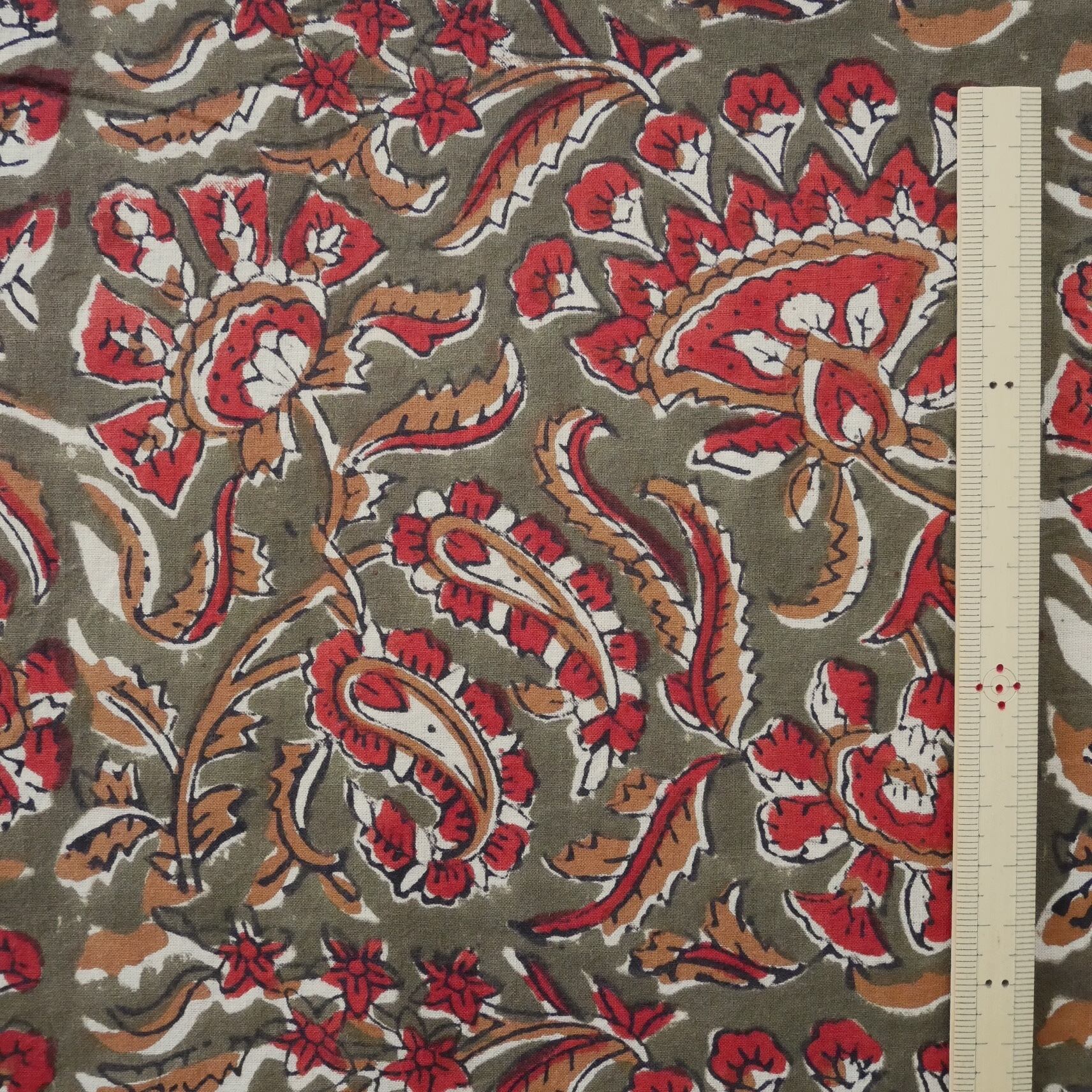 ハンドブロックプリント生地 インド更紗 綿生地 オリーブ色ベース×レッドやブラウンのボタニカル柄 薄手コットン BC-201024
