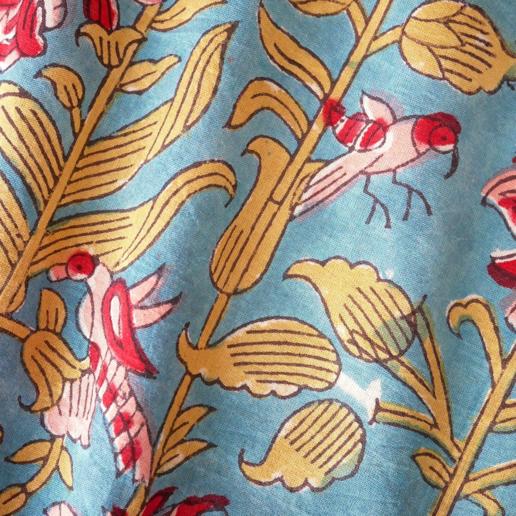 ◾️華やかなフラワーデザインと愛らしい鳥のモチーフが魅力的♪インドの伝統技法で仕上げたブロックプリント生地