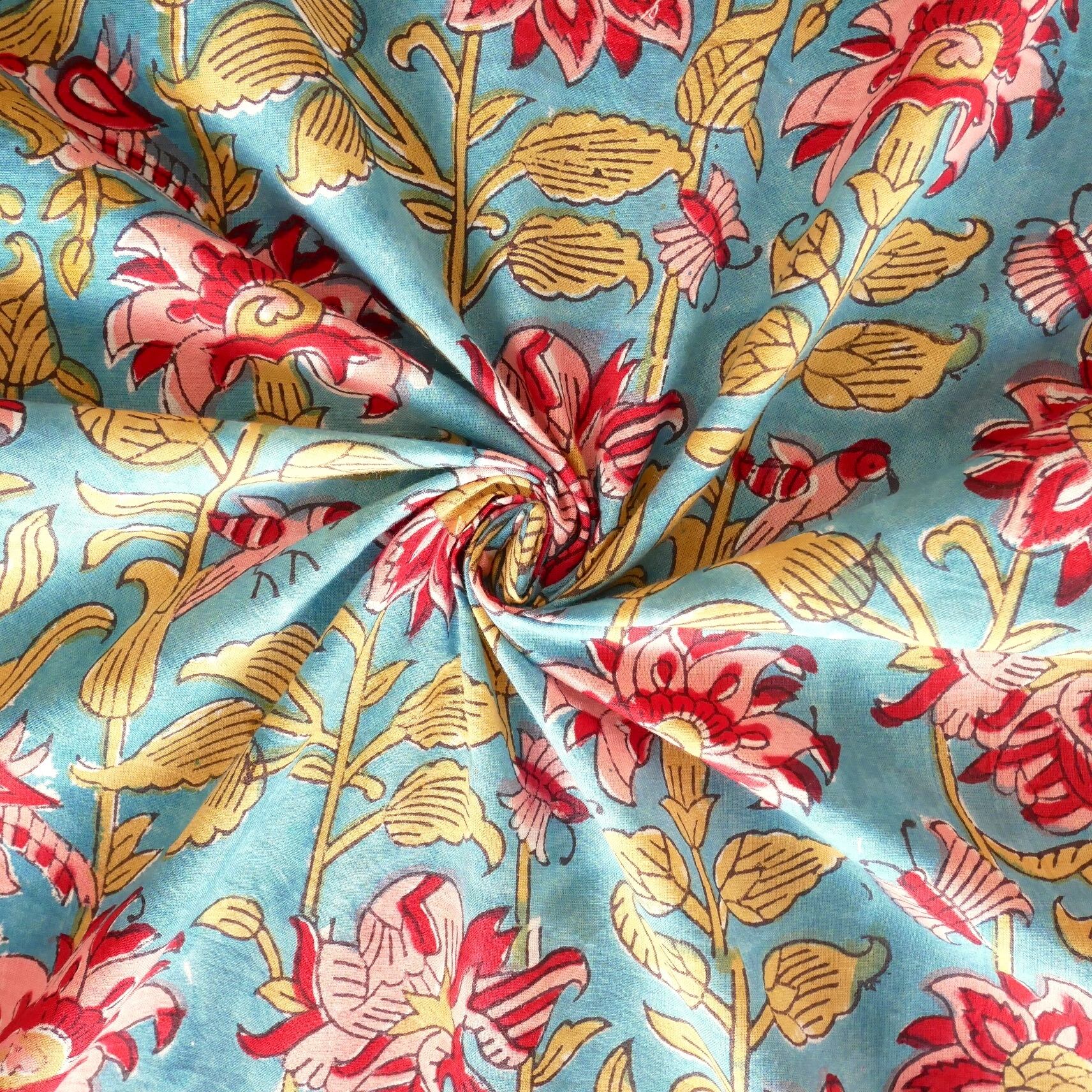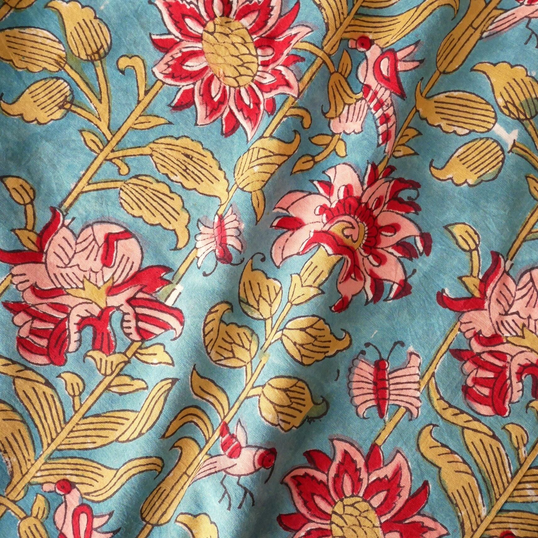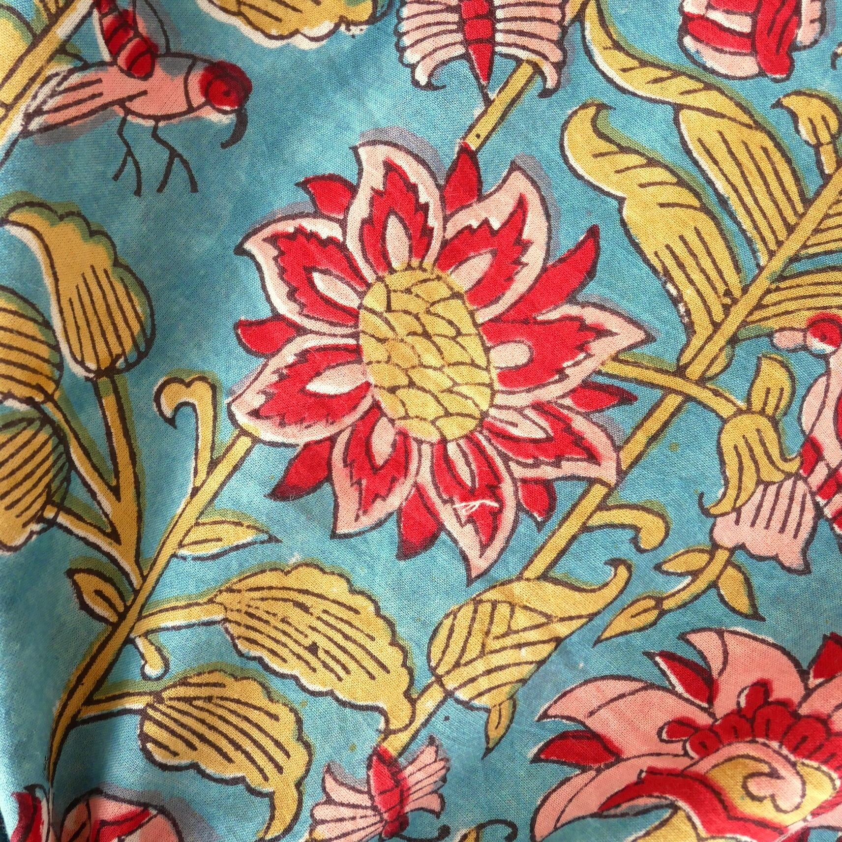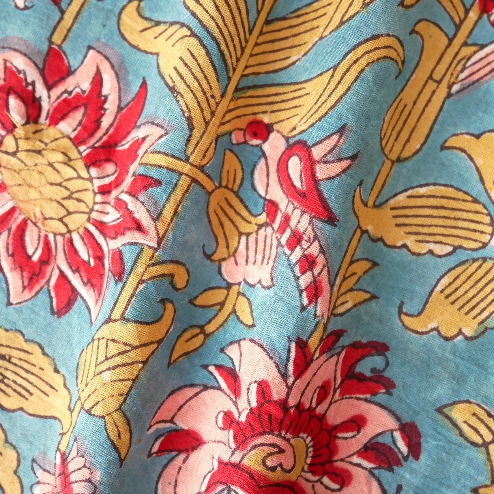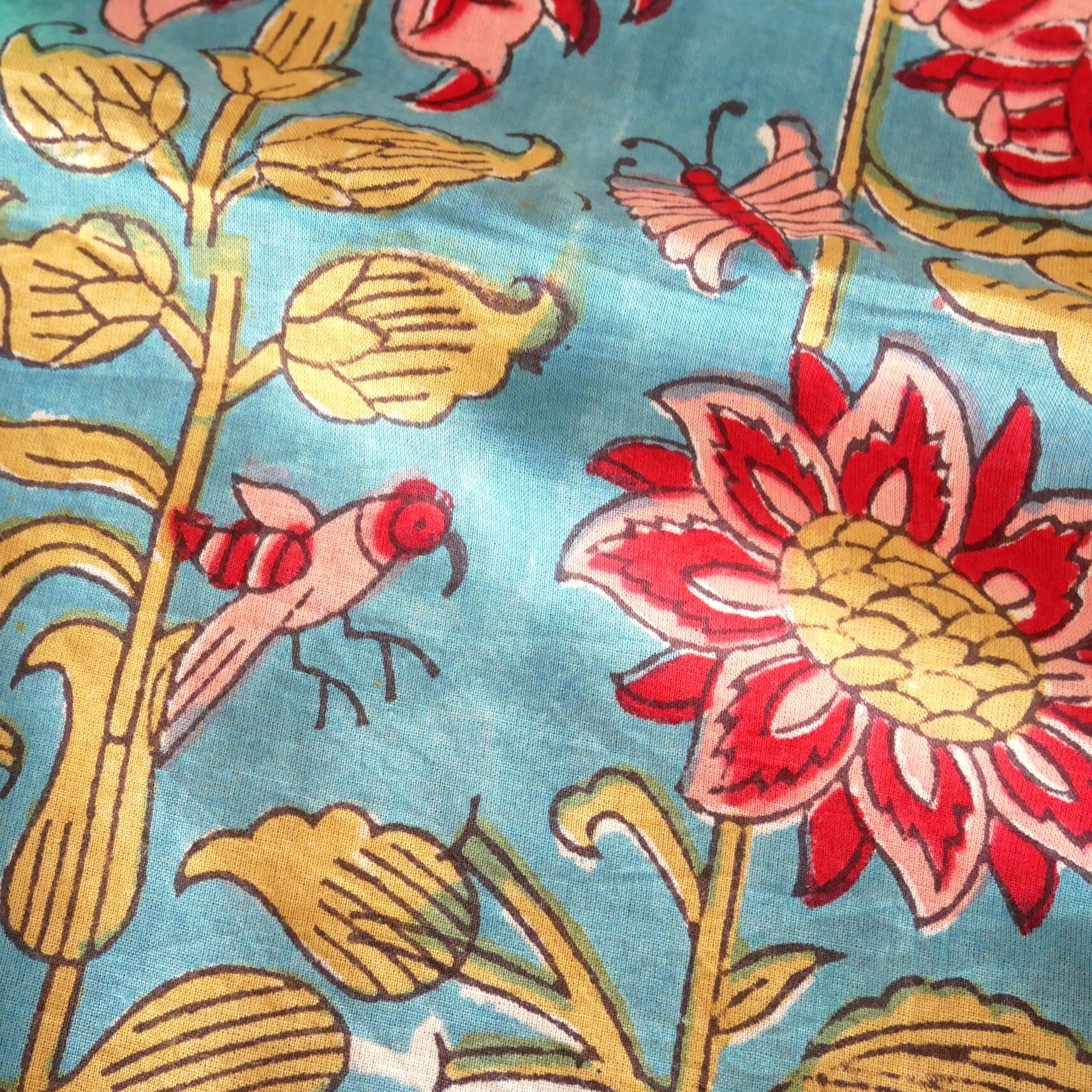 ハンドブロックプリント生地 インド更紗 綿生地 ターコイズベース×レッドとイエローの花と鳥や蝶 薄手コットン JE-241024