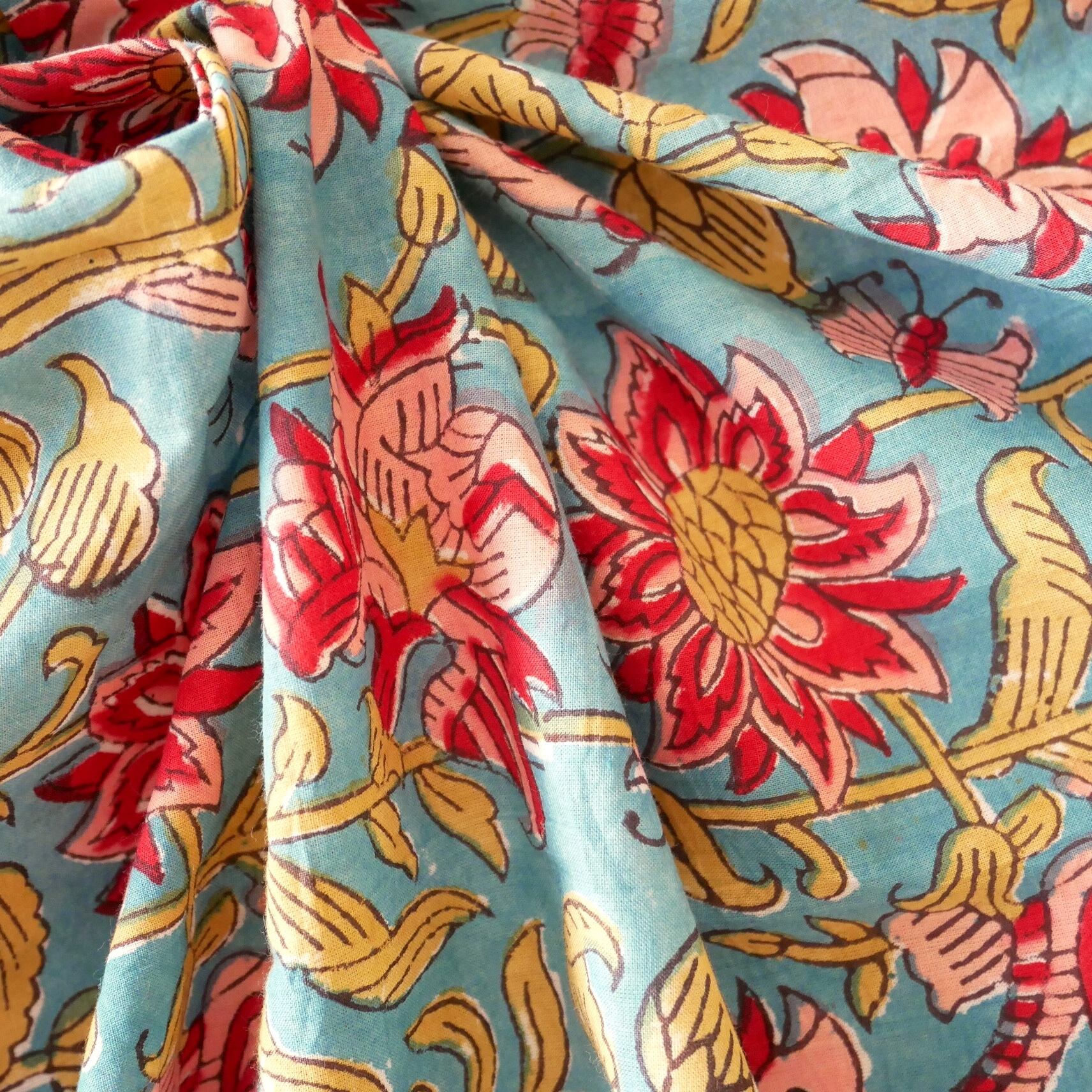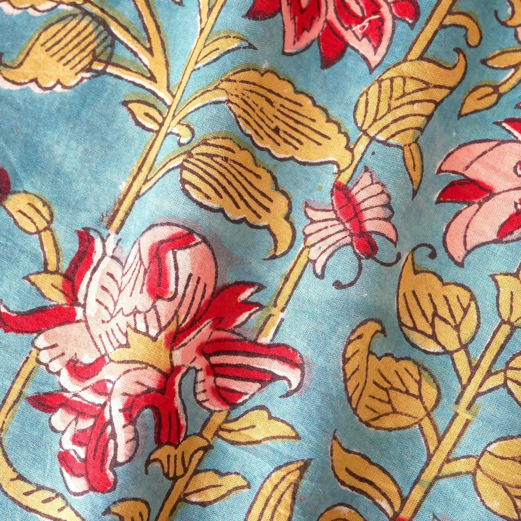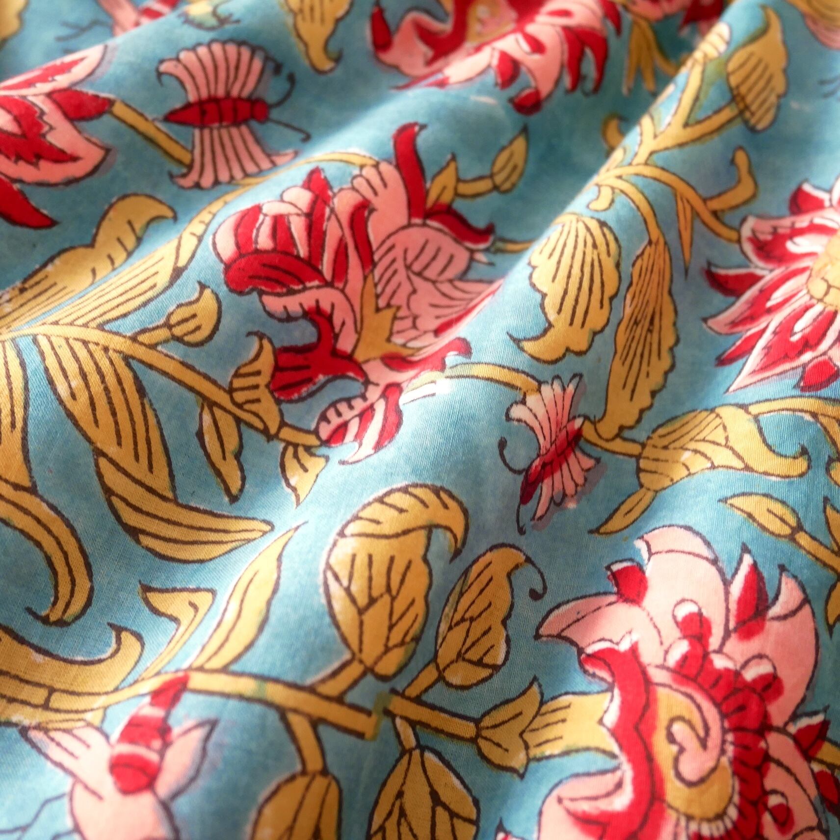 鮮やかなターコイズブルーを背景に、エネルギッシュなレッドとイエローのフラワーデザインが美しく映えるブロックプリント生地が入荷しました!