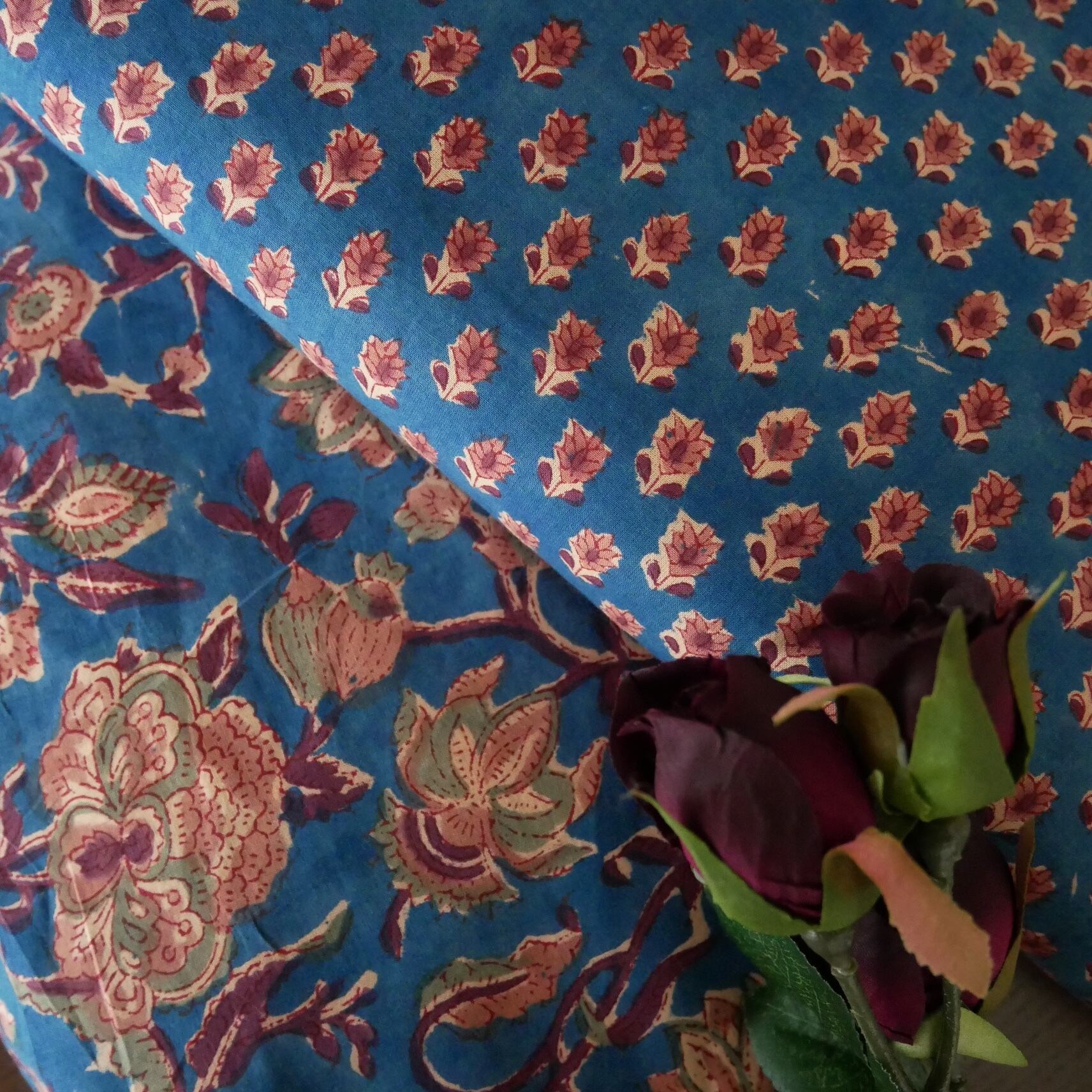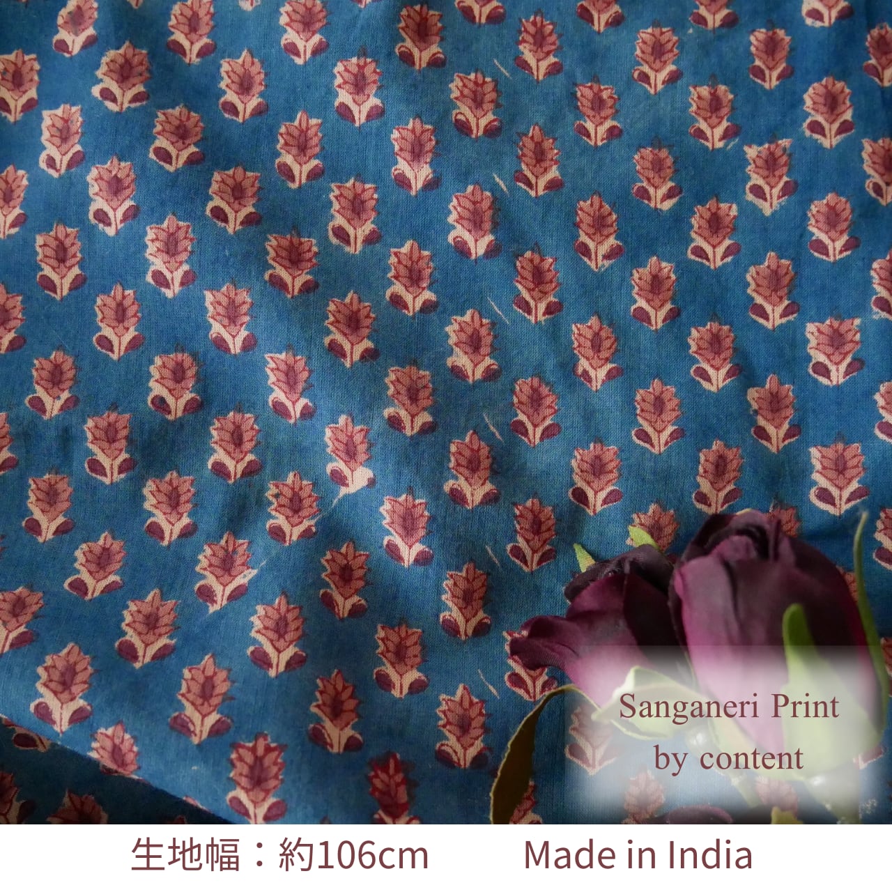 深みのあるブルーを背景に、小さな花々が並んだブロックプリント生地が入荷しました!
