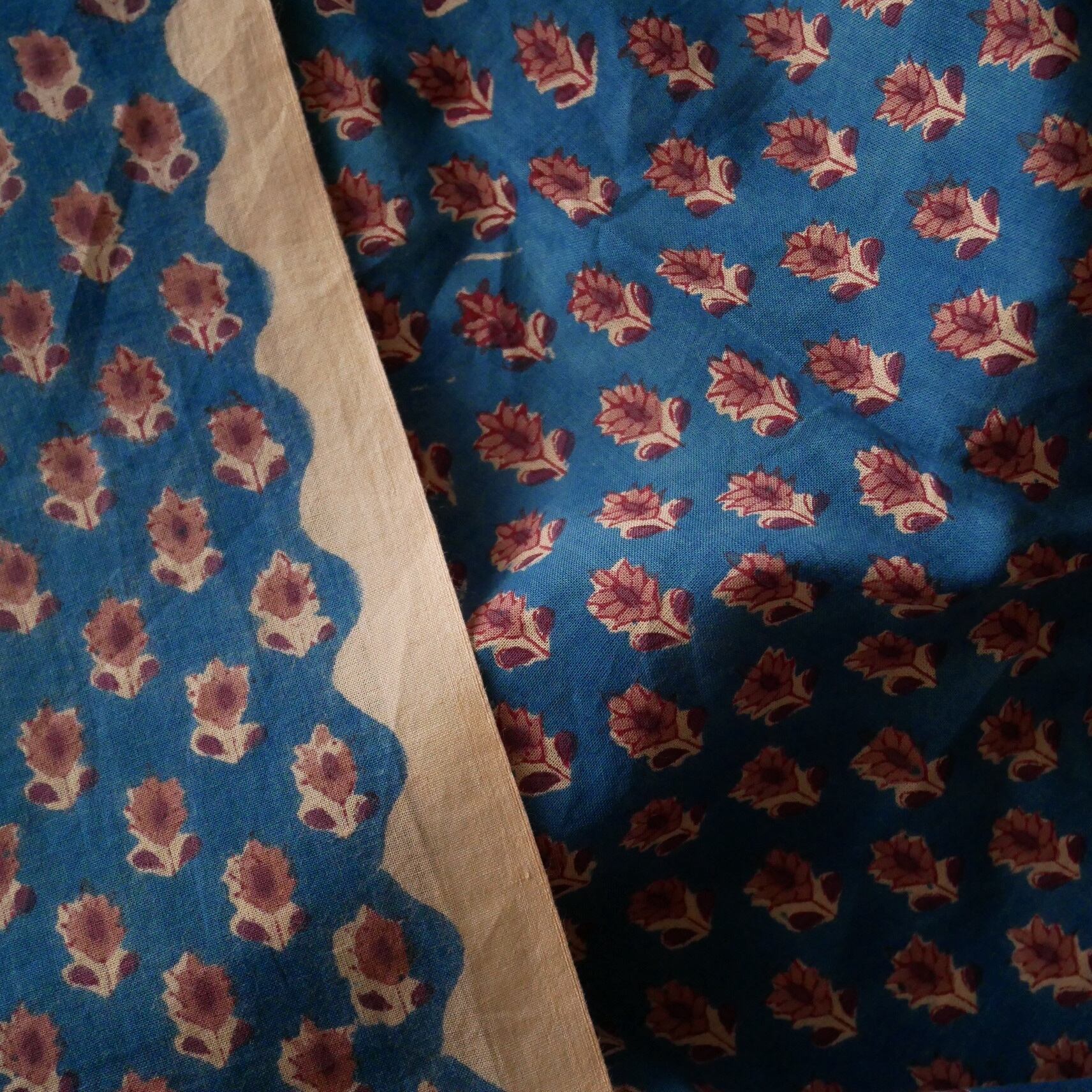こちらの生地は、インドの伝統的な木版を使って職人が丁寧に仕上げた、手仕事ならではの温かみが感じられる特別な一枚です。