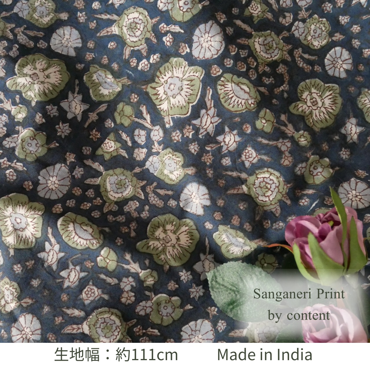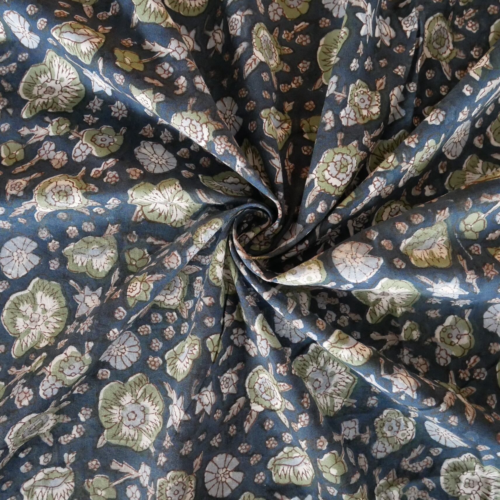 ハンドブロックプリント生地 インド更紗 綿生地 ネイビーベース×花柄 薄手コットン JE-241222