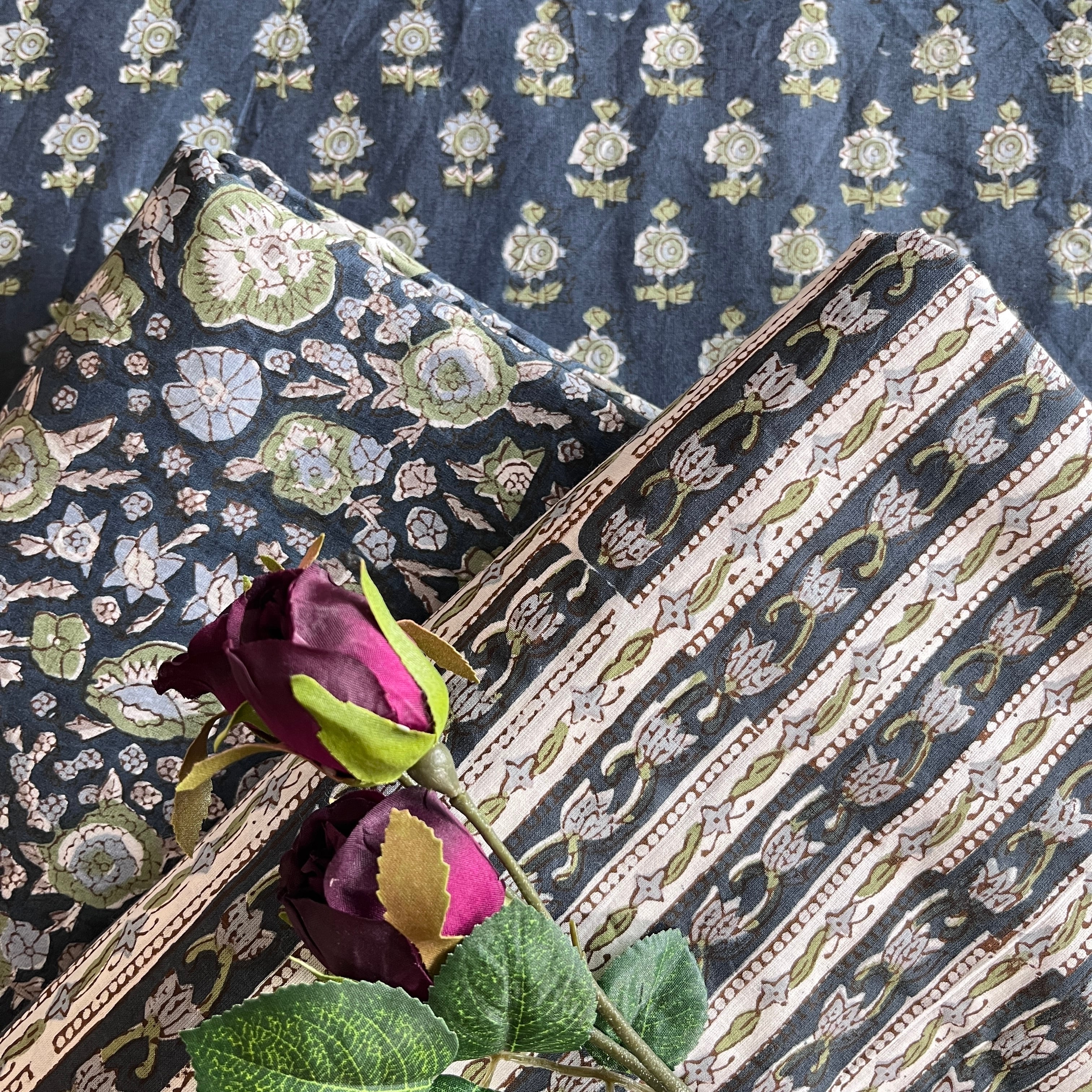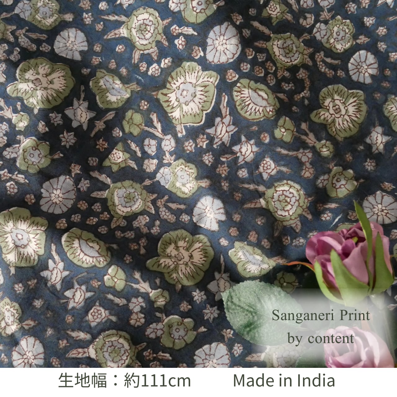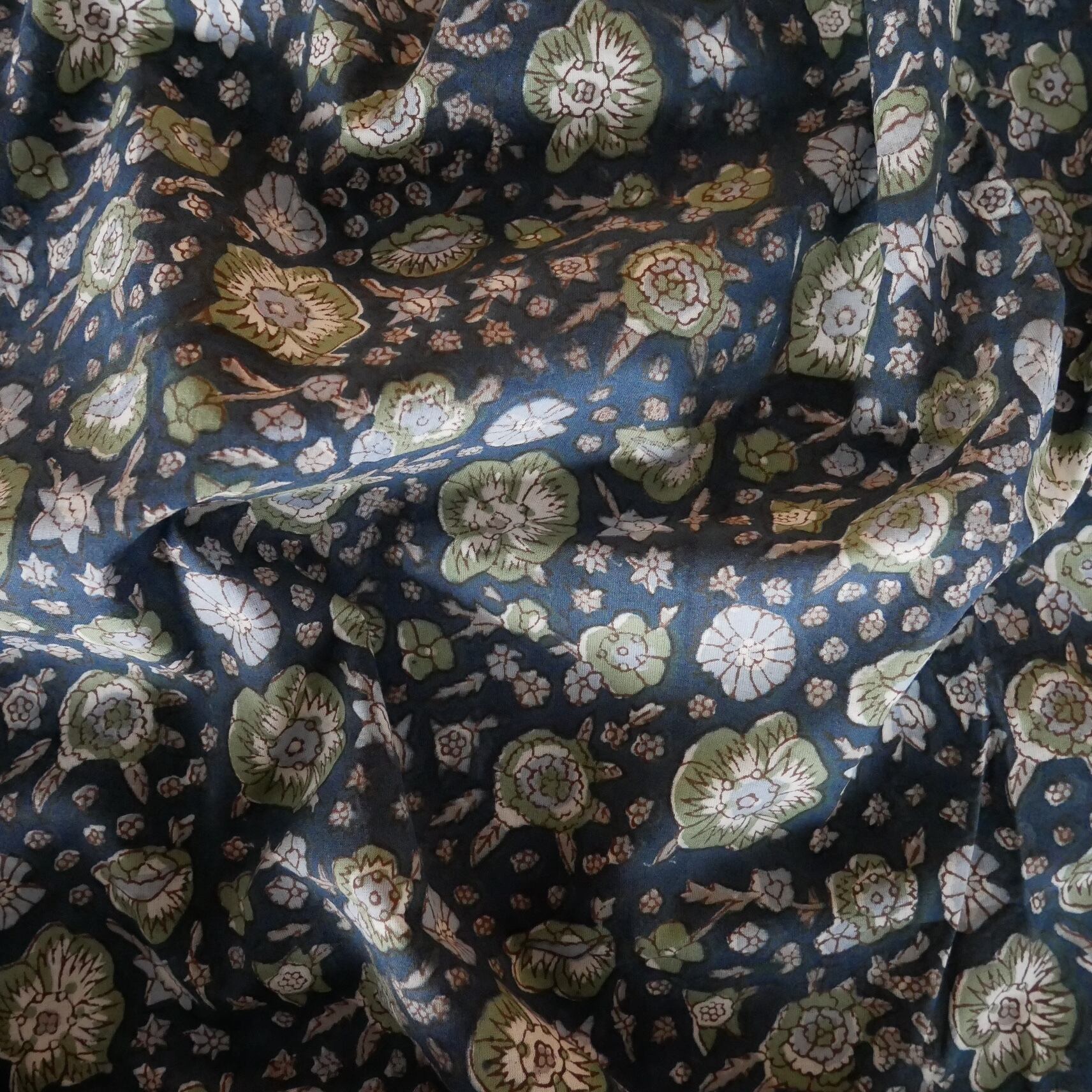 ◾️大小の花々が咲き誇るネイビーベースの生地—華やかさと落ち着きが共存するハンドブロックプリント