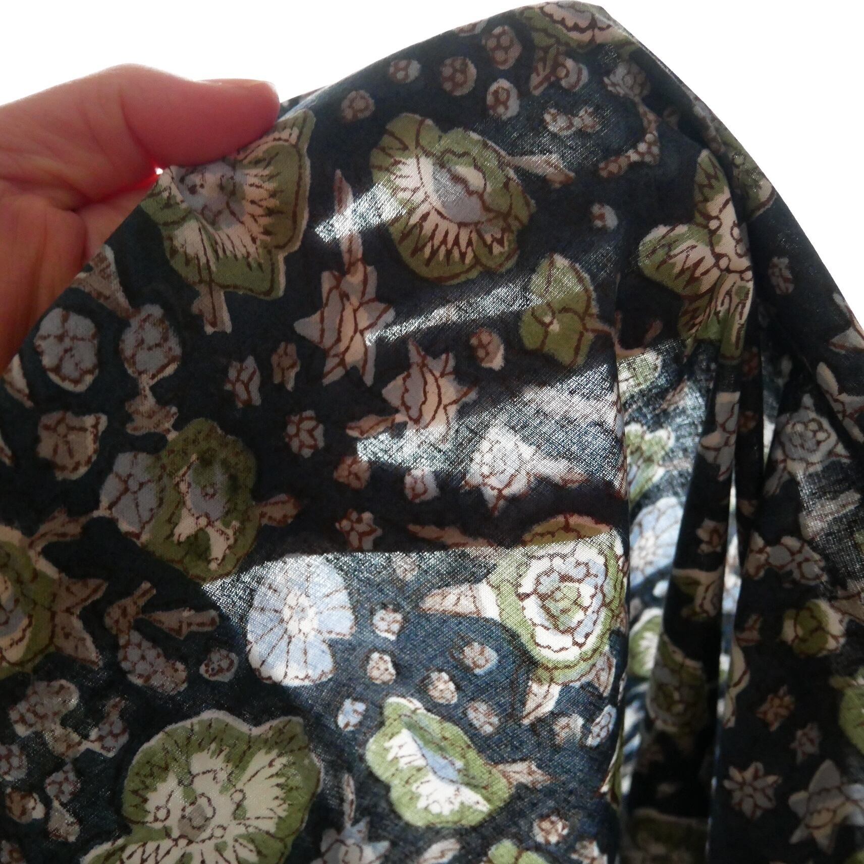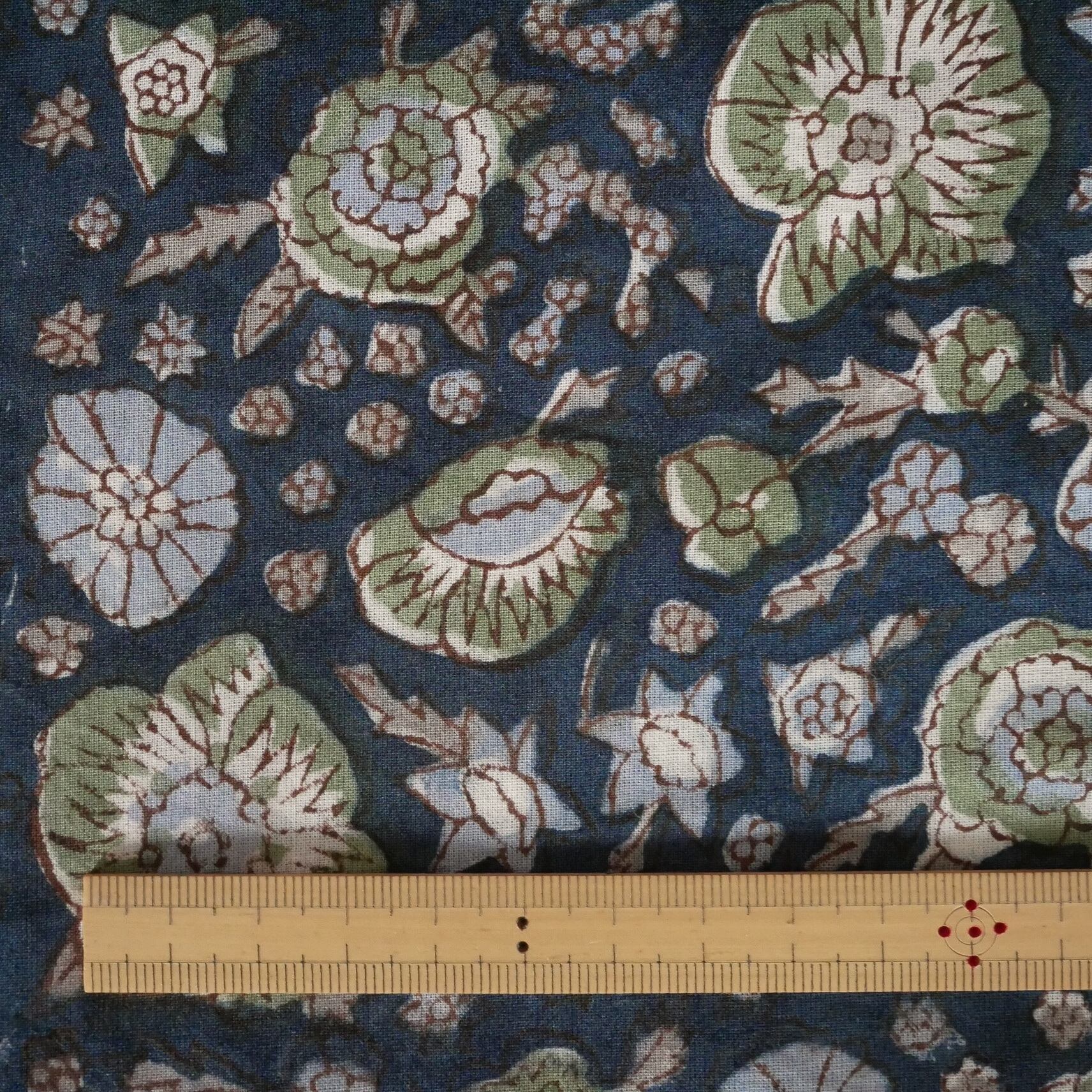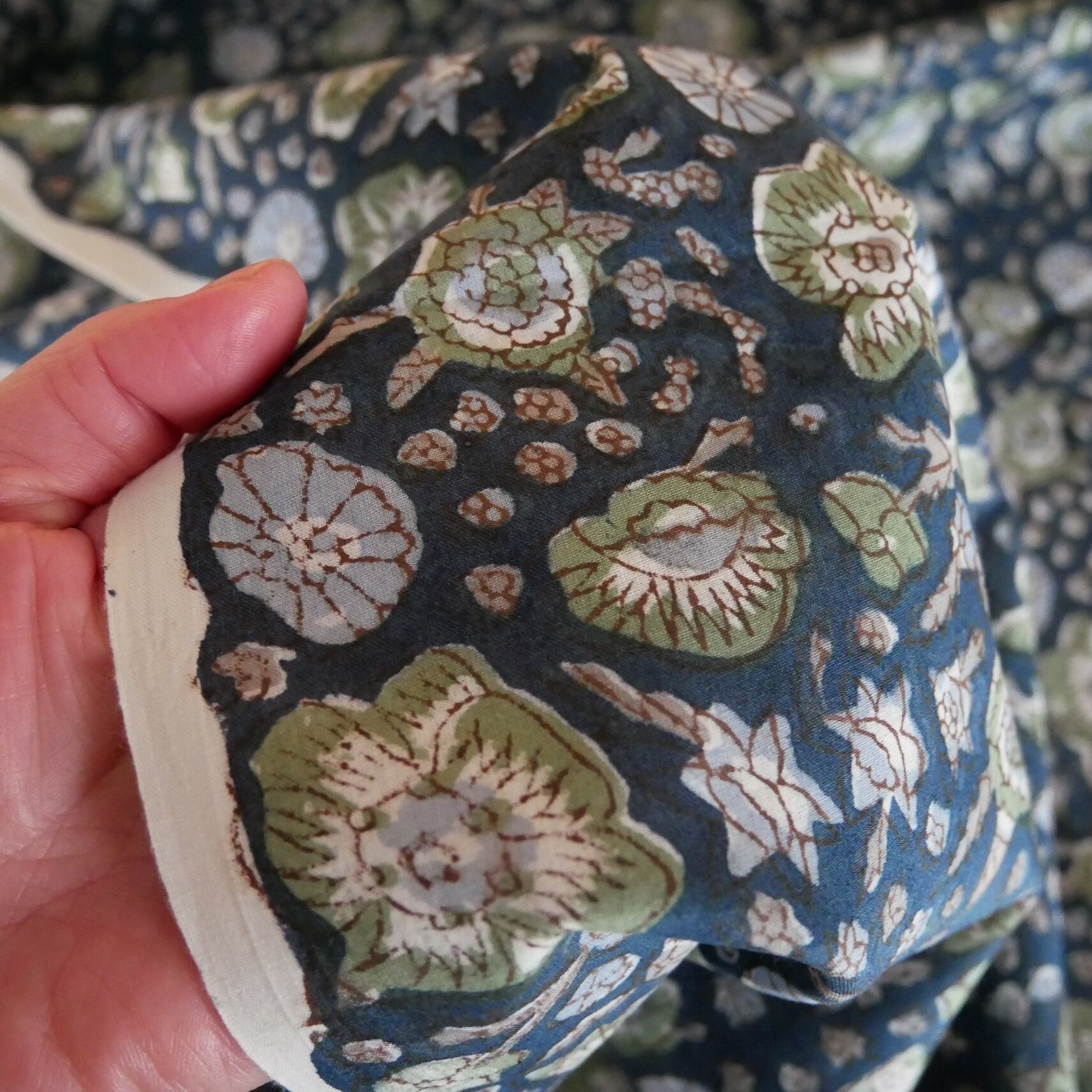 ◾️大小の花々が咲き誇るネイビーベースの生地—華やかさと落ち着きが共存するハンドブロックプリント