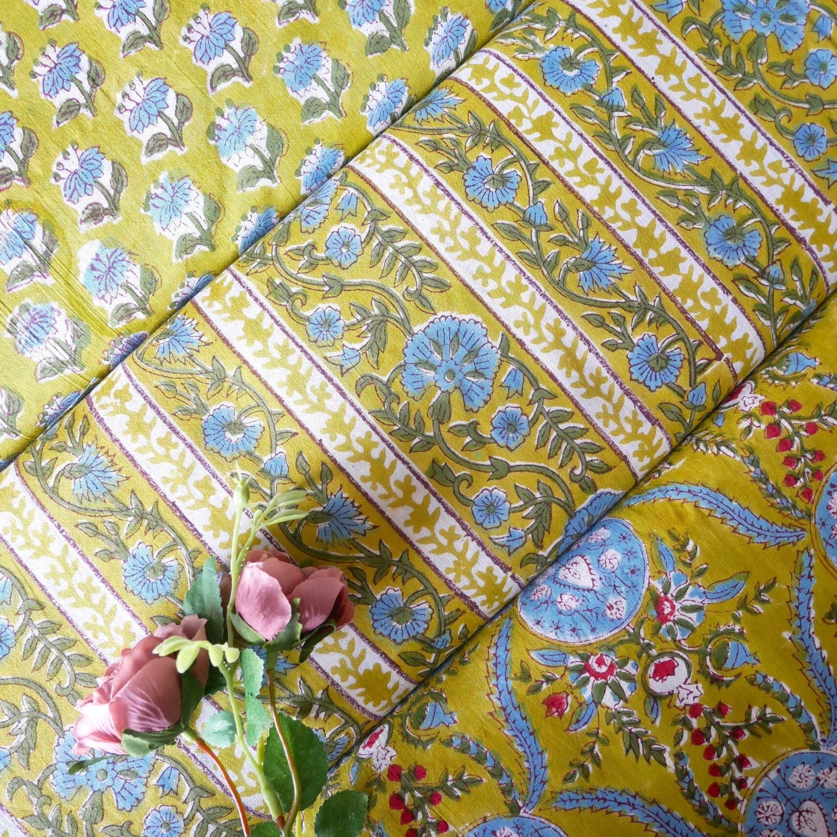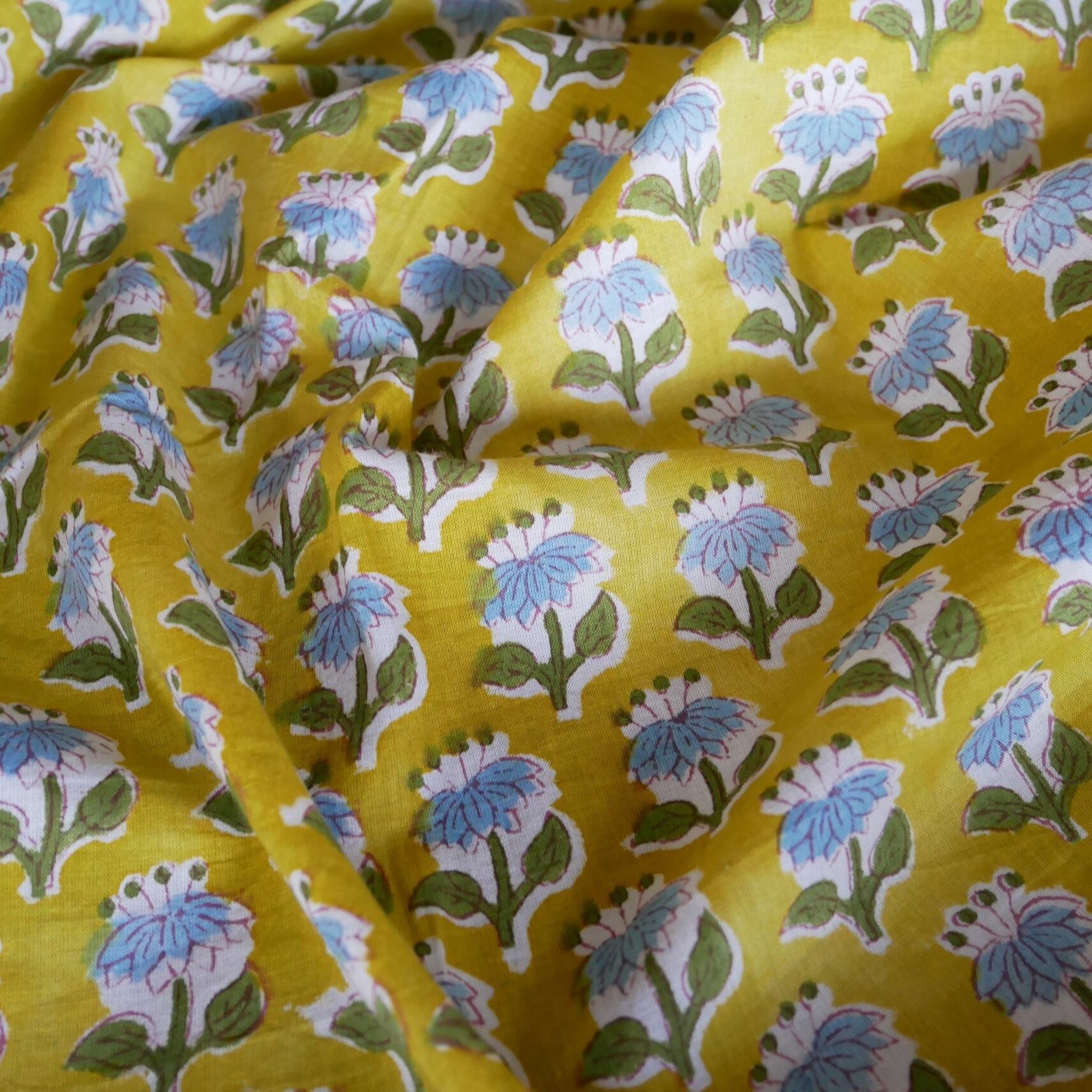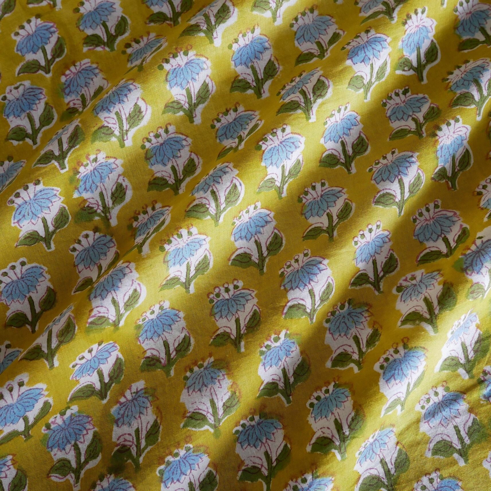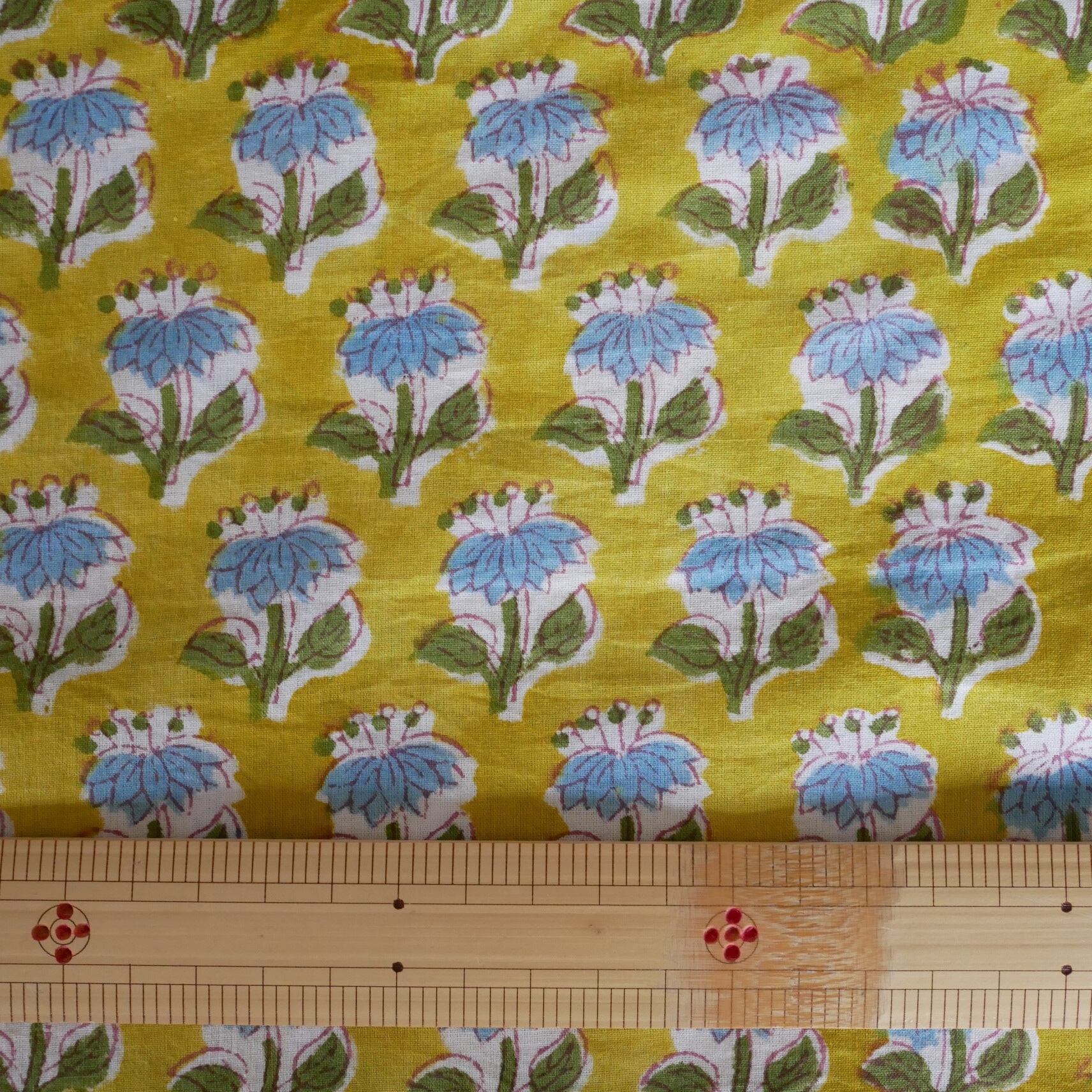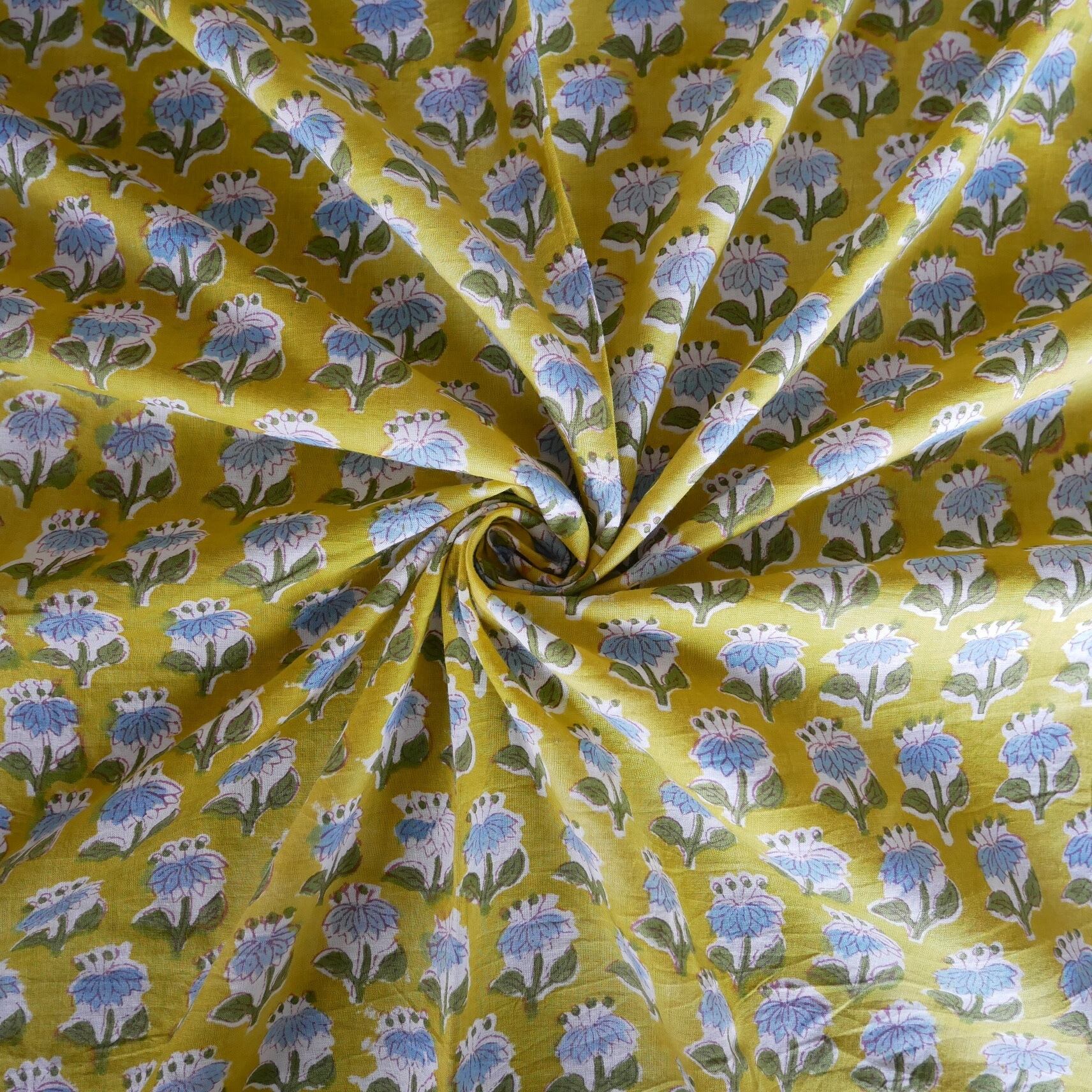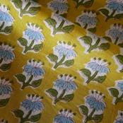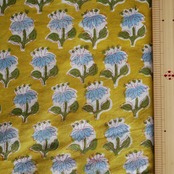 再入荷:ハンドブロックプリント生地 インド更紗 綿生地 マスタードイエロー×ブルーフラワー 薄手コットン JE-250845