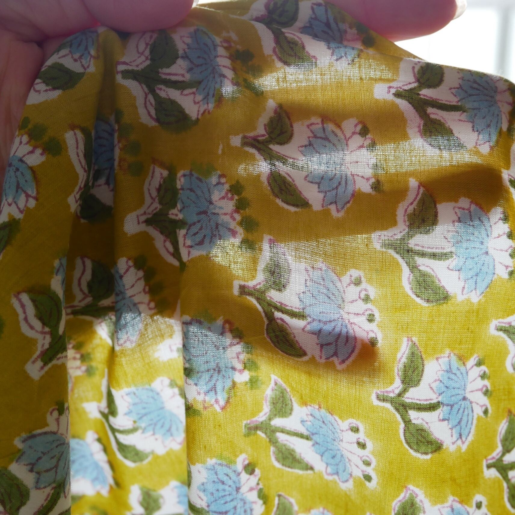 ◾️マスタードイエローに可憐なブルーフラワー、上品でナチュラルなブロックプリント生地
